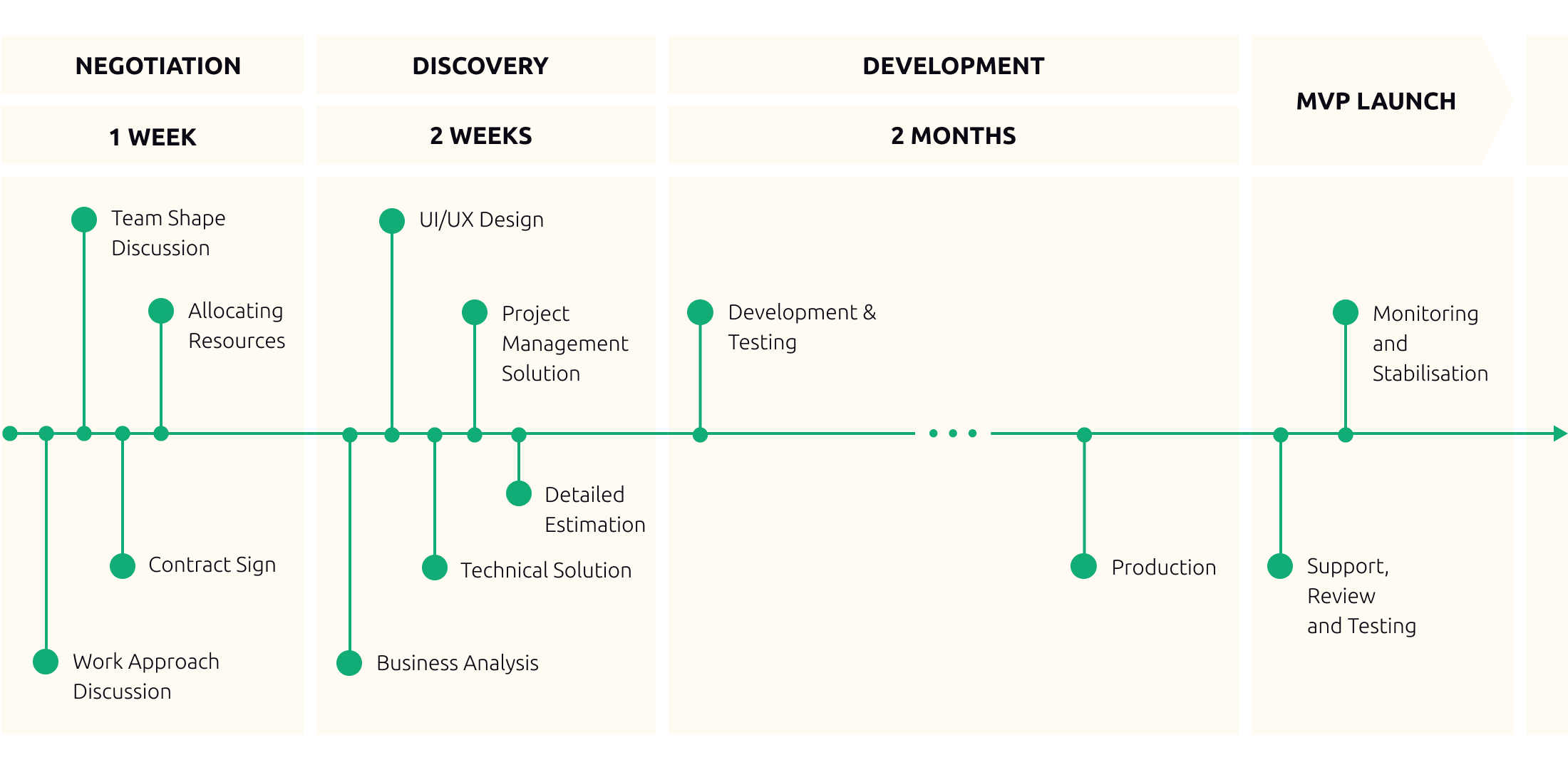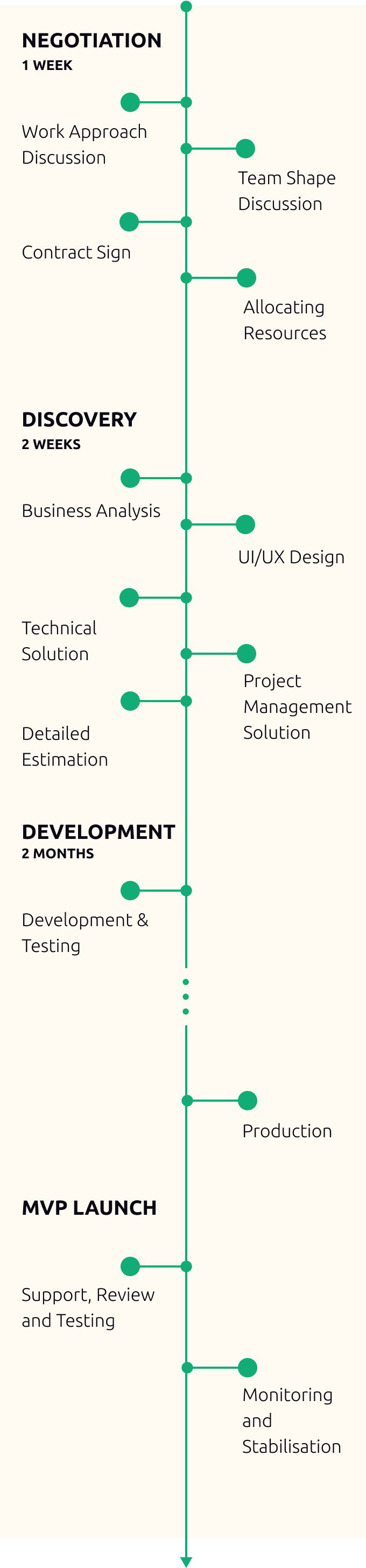 The Phase ensured all parties were aligned on the project's vision. We agreed on a Waterfall work approach, as all design mockups and user flows were to be finalized upfront, coupled with iterative delivery where completed application modules would be demoed upon completion. A core team of 4 developers was established to maximize development speed. The phase concluded with the signing of the contract and the allocation of resources, formalizing our joint commitment.